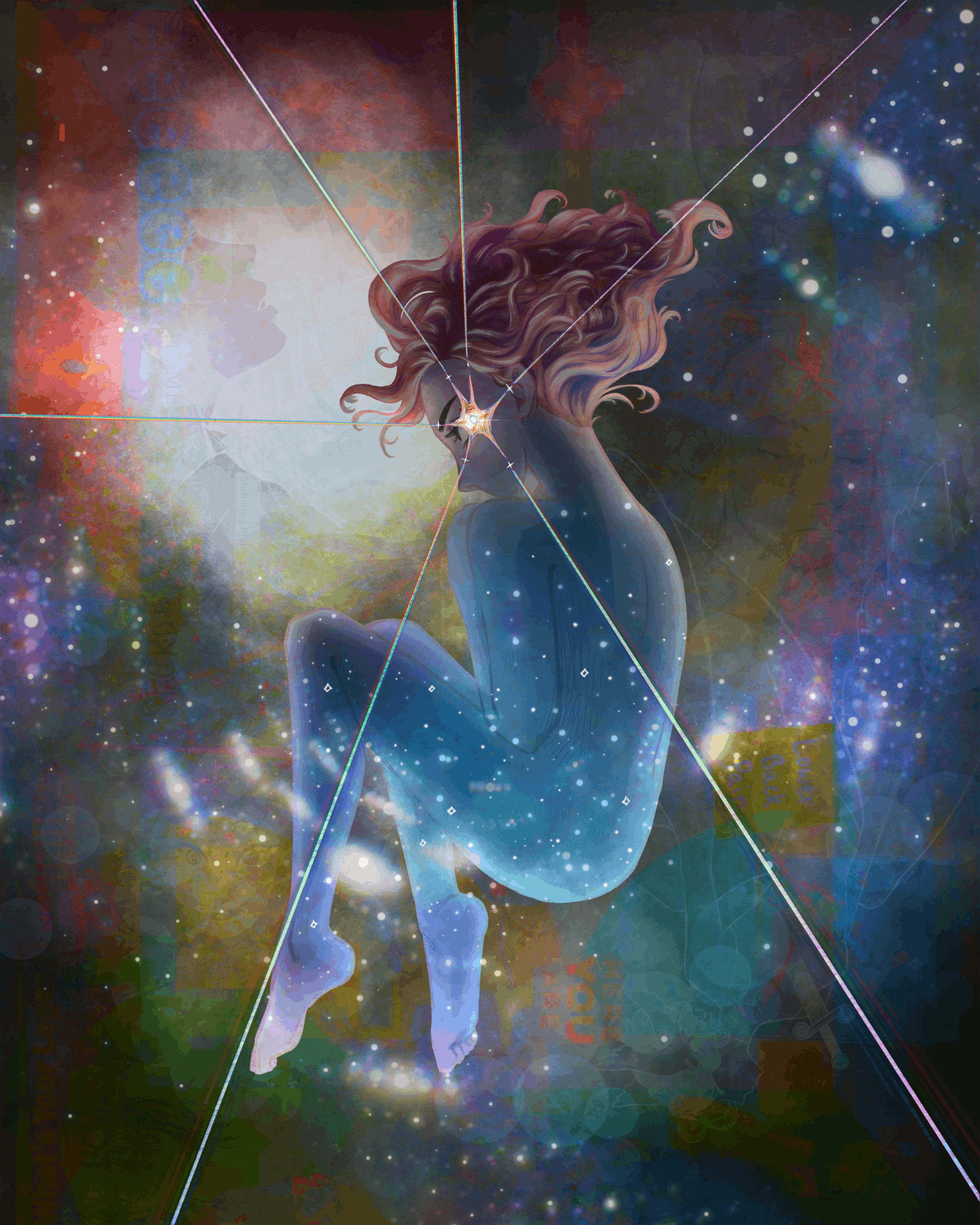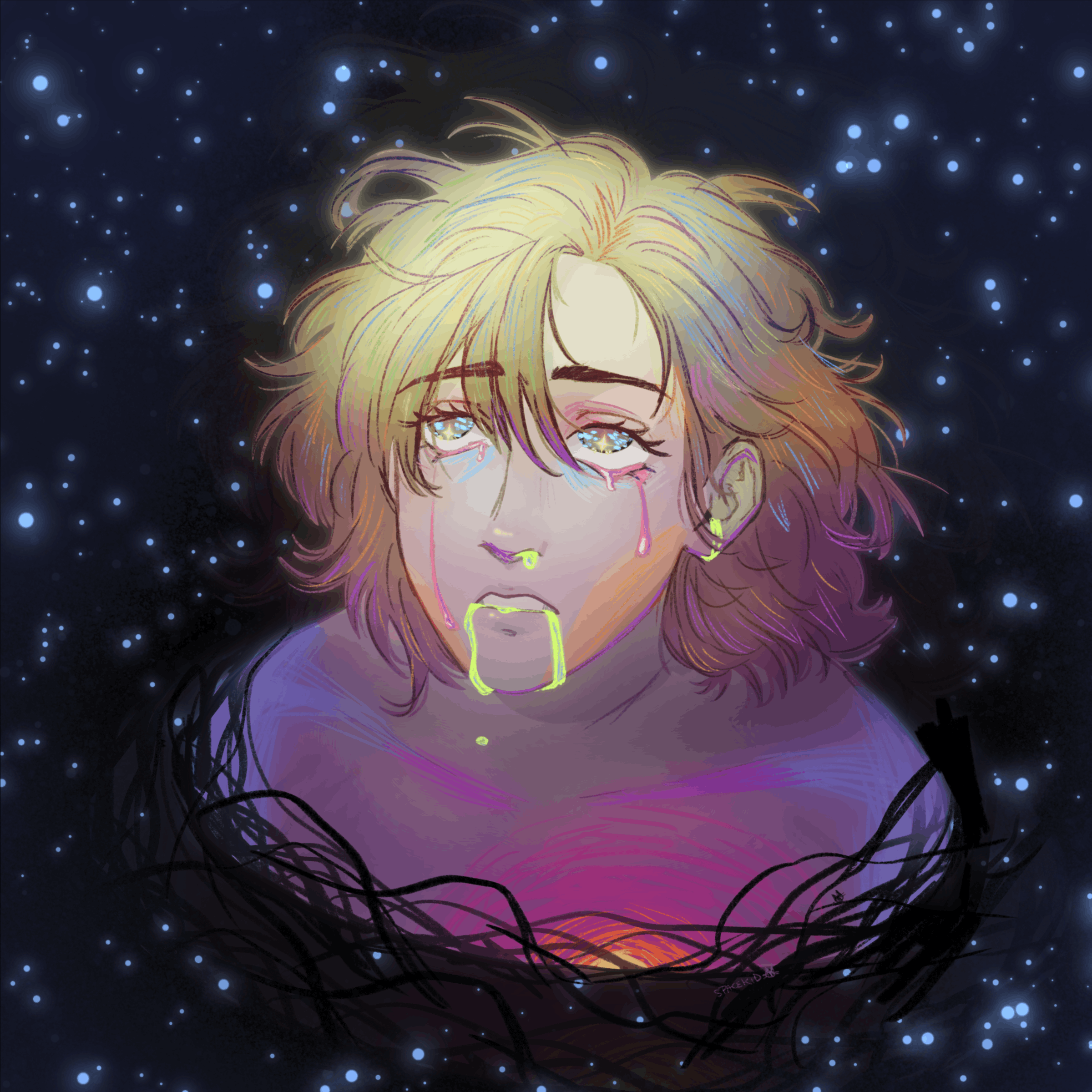 I’ve always said that I’m “allergic to making art that I don’t like” and this self-portrait encapsulates that idea perfectly. Surrounded by a cosmos created entirely of other artwork I’ve made, some featuring religious context to my life, another section featuring my partner, and a final major point with two of my favorite original characters, I’m drawn in a guarded position with a gaze hostile to viewers. Not only are the details things relating to my artistic life, but the space-themed surroundings tie into another of my deep-rooted interests in space and astronomy.