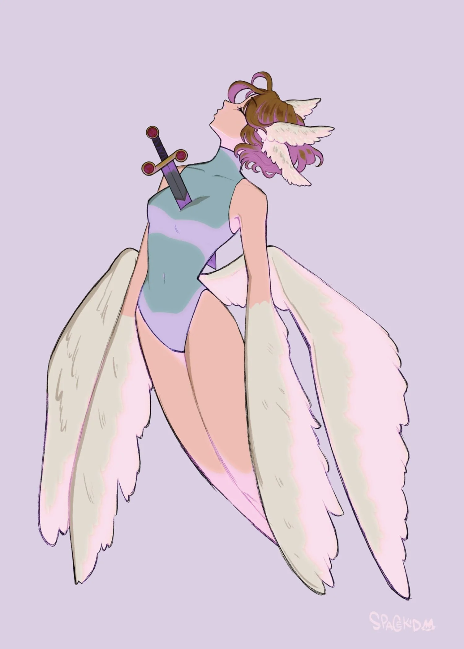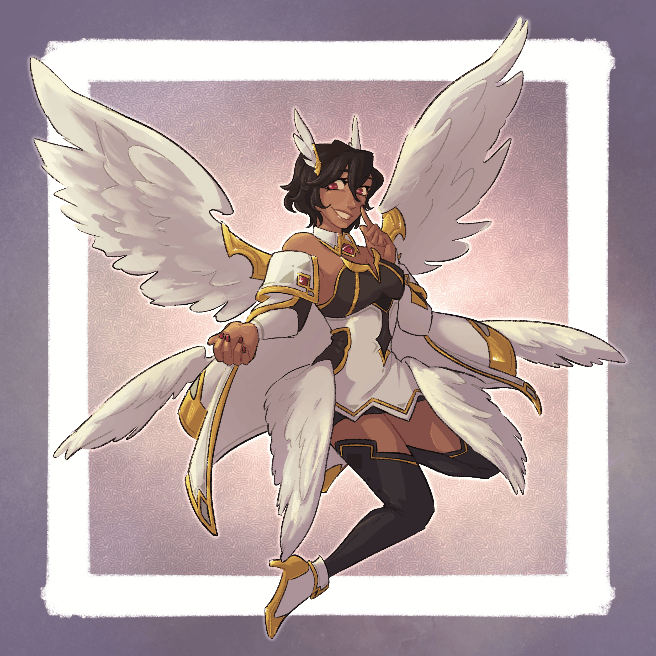 Annually, during the month of October, various art groups come together to create a community-set month-long art challenge where artists, following a set theme and keywords, create drawings daily to push themselves to be creative. In 2024, I participated in a version suitably named “Cringetober” where artists would draw things like bad MS Paint art or game characters. This day’s piece was for a character with an overly complicated outfit design and what better for that than a character with 4 full sets of wings?